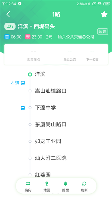 4、可以看到公交车的所在位置以及下一站公交到达时间,下方还可以进行换向、开启下车提醒、刷新车辆,最后经常走的路线可以点击右上角进行收藏。