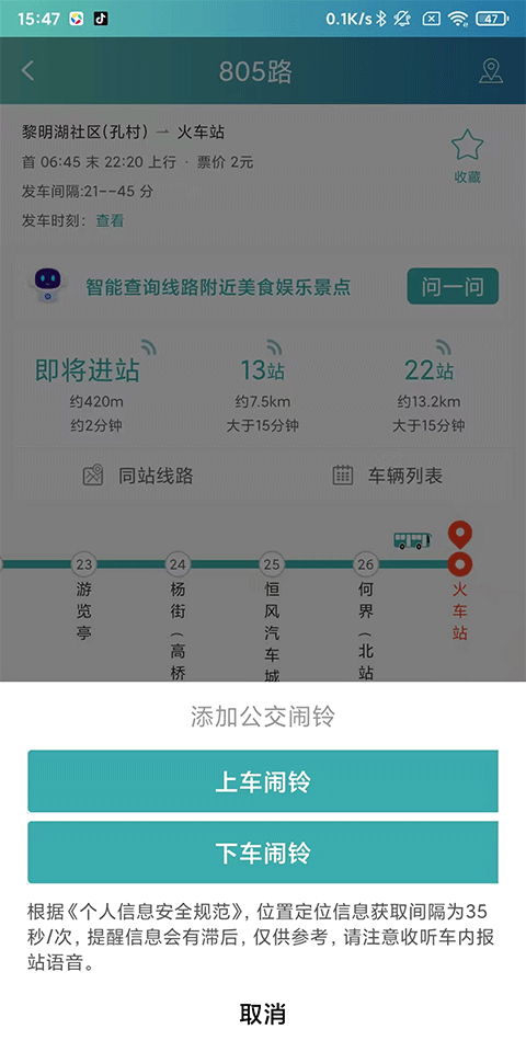 3、点击进入公交线路详情页,可以查看公交车的位置、与您所在距离、到站时间等,点击下方公交闹铃;