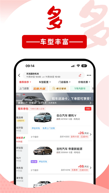 新用户专享1388元租车礼包,几十元即可租到心仪车辆。