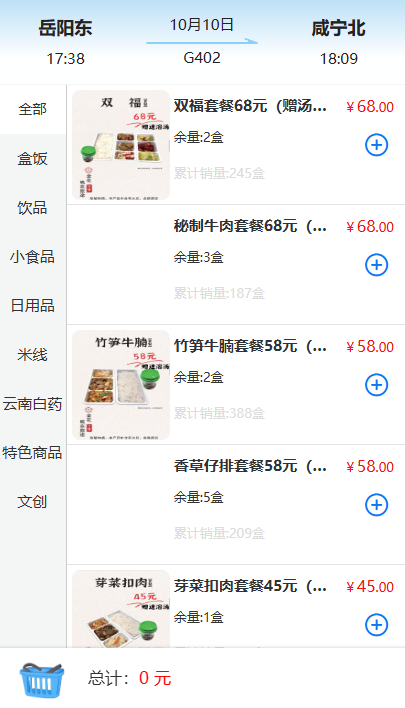 5、选好之后就可以进入点餐界面了,这里有盒饭、零食、饮料、水果、以及日用品可以购买,添加至购物车,点击去结算