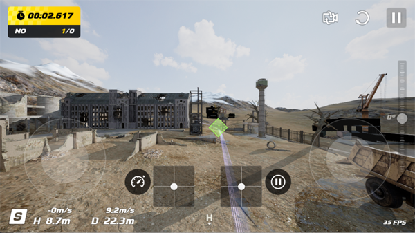 6、计时赛中需操控无人机穿越绿色标记点,左上角显示耗时,完成后可刷新成绩提升飞行技巧。