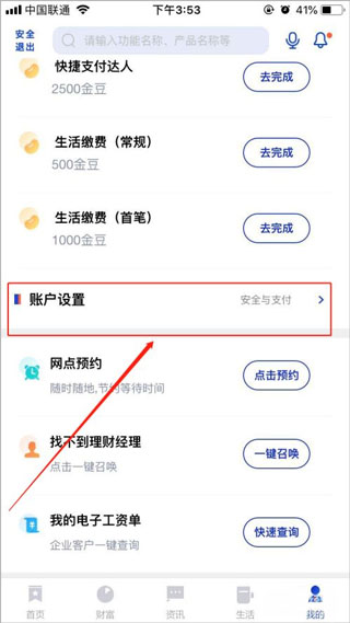 2、打开后,首页上面列出了4.5个常用功能,下面则是理财产品,点击上面的“我的账户”;
