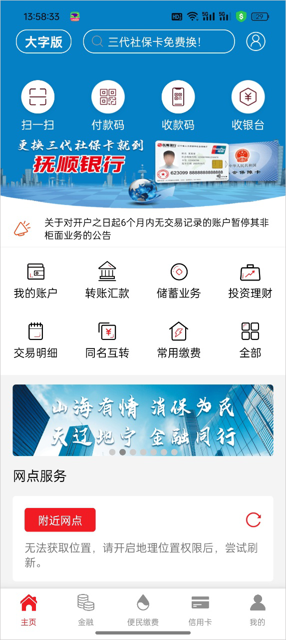 1、打开抚顺银行手机银行,在主页可以看到很多实用功能,如我的账户,转账汇款等;