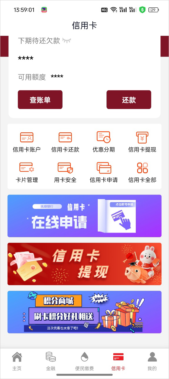 4、信用卡也能在线管理,并且支持用户信用卡账单信息的不同,在线处理信用卡还款问题;