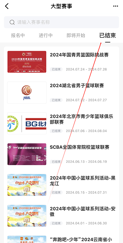 2、点击已结束的赛事,选择自己想要看的赛事点进去;