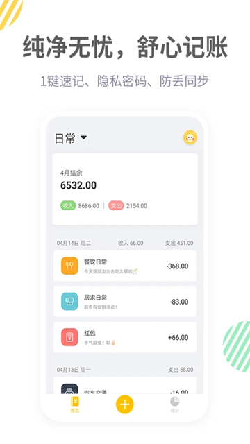 记账鸭app是一款记账极速、简单易用的专业记账软件,界面非常简约,资产变化一目了然,同时这里支持一键快速记录收支,然后自动生成收支报告、资产账户趋势图,可以很好的让你了解到你的资金流水,提醒你月月不再月光。此外,记账鸭app还支持加密功能,不想让人看见流水,可以在这里设置数字、手势、指纹密码锁,多重加密守护隐私,保护你的资金情况。