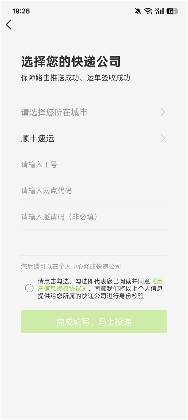 2、在这里,填写自己所在的快递公司,完成填写之后,就可以立马投递