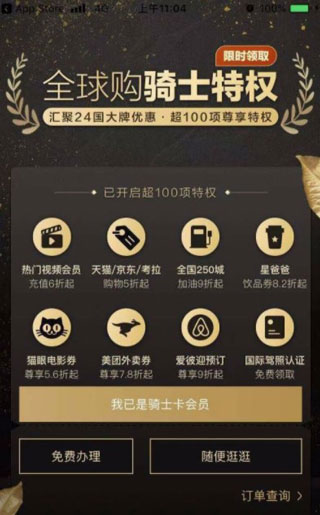 全球购骑士特权目前已接入优质的全球尊享特权,其中包括了热门视频会员充值6折起、全国62城加油9折起、全国贵宾厅9.9元体验、网易考拉购物4%返现等,将会陆续接入更多独家特权。