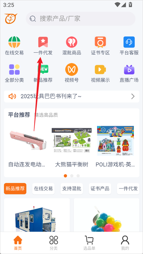 1、打开玩具巴巴App,在首页找到并点击【一件代发】入口;