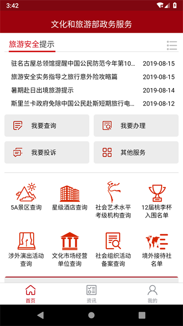 文旅政务app是由中华人民共和国文化和旅游部主办、文化和旅游部办公厅主管,委托文化和旅游部信息中心负责规划、建设和管理的一个政务服务平台,该平台为公众提供了便捷的服务功能,有办理、查询、咨询、投诉等功能,只要有一部手机足不出户就可以在手机上办理各种事情,减少用户外出办事的时间,让生活更加美好。在文旅政务服务平台可以办理很多事情,比如全国艺术科学规划项目申报、科技项目申报、社会艺术水平考级、出境游组团社签证等等,也可以查询社会艺术水平考级考后成绩、5A景区查询、星级酒店查询等等,另外在这里还能第一时间看到各种政策和服务,消息抢先一步知道!