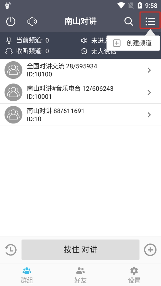 3、创建好之后,别人就可以点击旁边的放大镜进行搜索,然后进入频道,点击下方的【按住对讲】就可以开始交流;