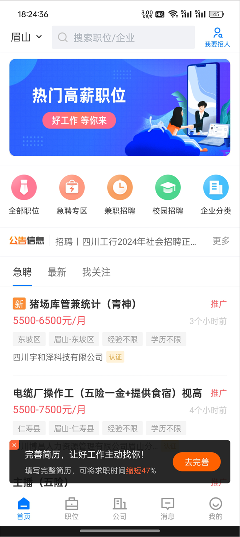 v3.0.2眉山人才网是一款专注于眉山本地的求职招聘类App,涵盖全职、兼职、普工、技术、管理等多个行业领域岗位,为本地求职者和企业搭建高效、精准的人才对接平台。求职者可一键投递简历,智能匹配合适职位,实时查看面试通知;企业用户则能快速发布岗位、管理简历,大幅提升招聘效率。新版本眉山人才网App界面简洁易用,功能覆盖全面,特别适合在眉山工作、生活、或准备回乡发展的用户使用。不仅提供实时岗位更新,还配有面试技巧、职场资讯等成长内容,帮助用户从“找得到”到“找得好”。
