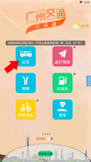 1、下载安装后打开广州交通行讯通app,之后点击公交选项