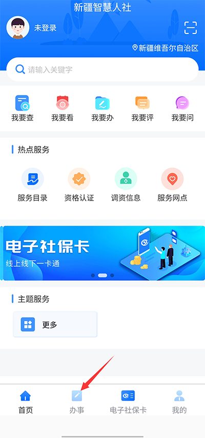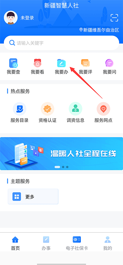1、打开新疆智慧人社APP,点击“我要办”