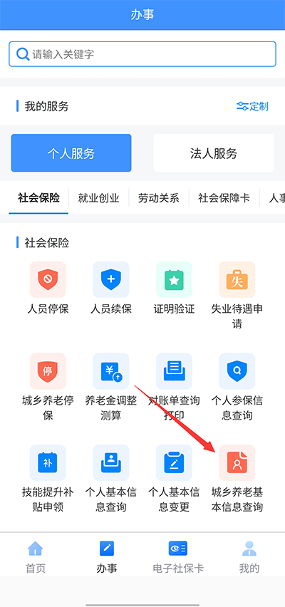 2、在办事版块内点击城乡养老缴费信息查询即可
