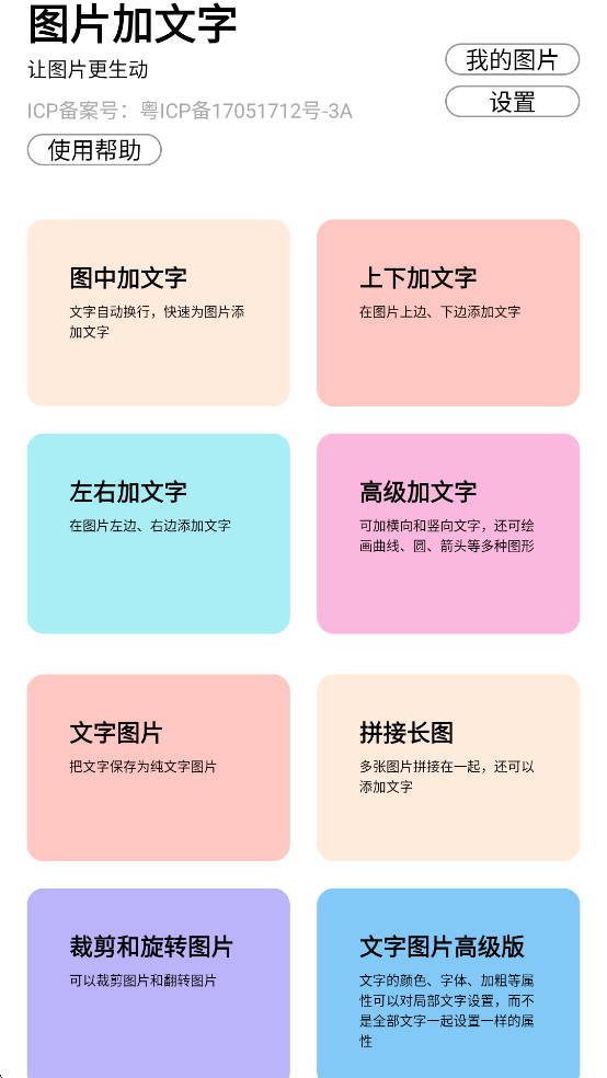 图片加文字app是一款快速让图片加上文字的软件,软件内没有繁杂的广告,简洁实用,用户可以在图片上加文字、制作文字图片等等,功能十分丰富。用户可以通过图片加文字app,对图片进行排版编辑,加文字、贴纸等,只要你想加什么就能加什么,有需要的朋友欢迎下载使用!