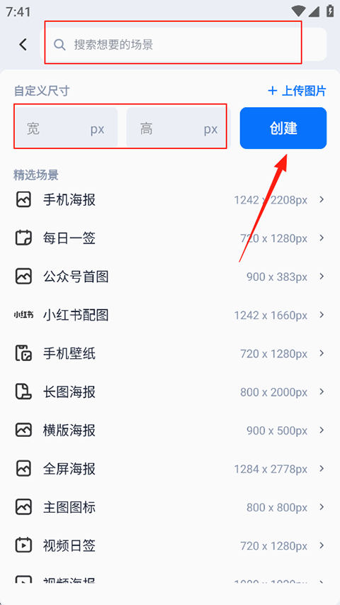 2、您可以在搜索栏搜索您想要的场景、或者自己创建,下方也提供了精选场景模板供用户使用;