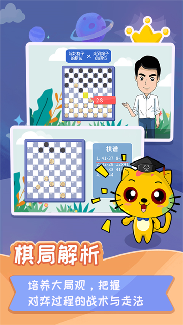 每课结束通过儿歌总结的方式,让孩子轻松且不乏味的记住课程要点,并配合课后练习,对所学知识进行复习和巩固。还有国际跳棋人机对弈功能,让孩子运用所学。