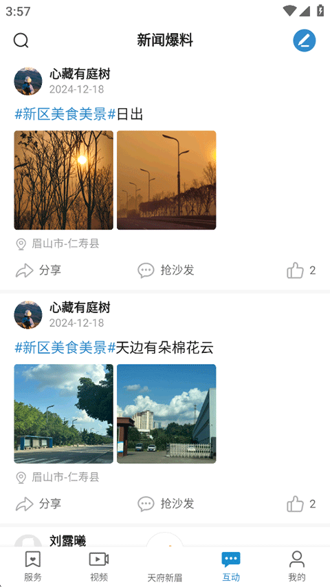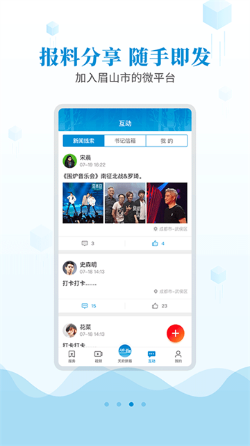 5、互动:浏览网友发布的分享生活动态和新闻报料,点击右上角前往投稿;