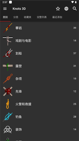 Knots 3D最新版是一款非常专业的3D绳结学习工具,在这里拥有着非常丰富的绳索打结方式,用户可自由浏览绳结方法,并且里面所有的绳结教程都是由动态展示出来的,画面非常的高清,不管你从什么角度看,都可以查看到各种细节。另外,Knots 3D最新版不仅还可以在里面调节速度,随时暂停或调整动画,还支持缩小或者放大其画面功能,你可以根据自己的喜好来定,让你对绳结有全新的认知。同时,软件内还内置了140多种的绳结,为了方便查看,还对其绳结方法方式做了详细的分类,你可以通过类别、类型、收藏或查看整个库进行浏览使用,可谓是非常的强大。对此有需要的朋友们欢迎来本站下载使用!