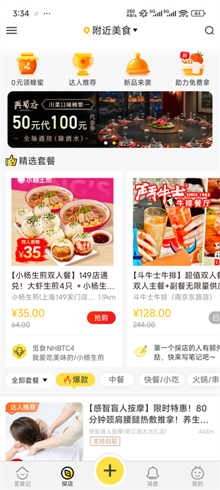 3、附近美食:热门商圈一网打尽,本地美食地图一键获得;点击任意商圈,即可获得该商圈的探店美食福利,专属于你的美食指南。