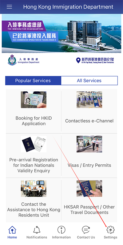 1、下载香港入境事务处官方版app打开软件,点击设置