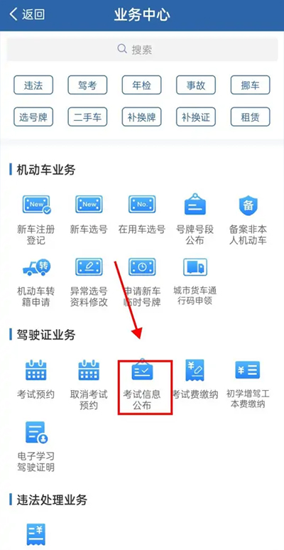2、接着来到业务中心界面后,在驾驶证业务标题下可找到“考试信息公布”选项并点击它