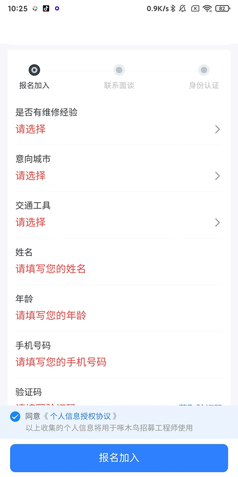 3、接着填写相关个人信息,完成后点击下方的报名加入,等待联系面谈及身份认证,通过后即可成为啄木鸟家庭维修师傅。