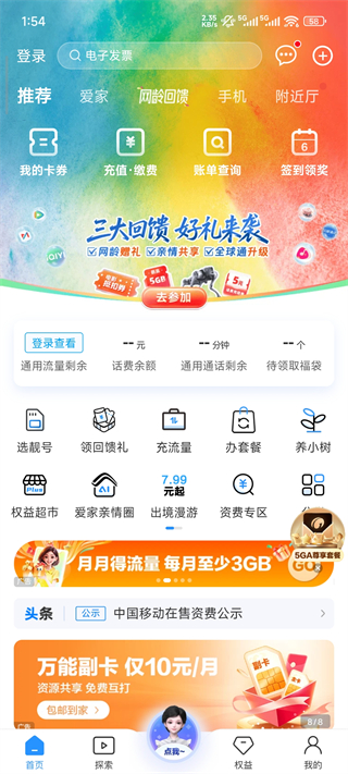 首页集充值·缴费、账单查询、爱家亲情圈、出境漫游等一一站式功能板块体验食住行娱
