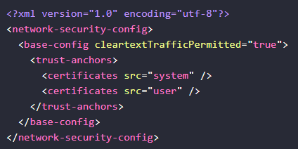 注意:请在发行版本中移除此配置,更多有关网络安全配置文件资料,请参考:Android开发文档。