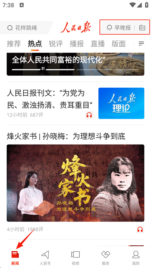1、打开人民日报APP,点击新闻-右上角的早晚报;