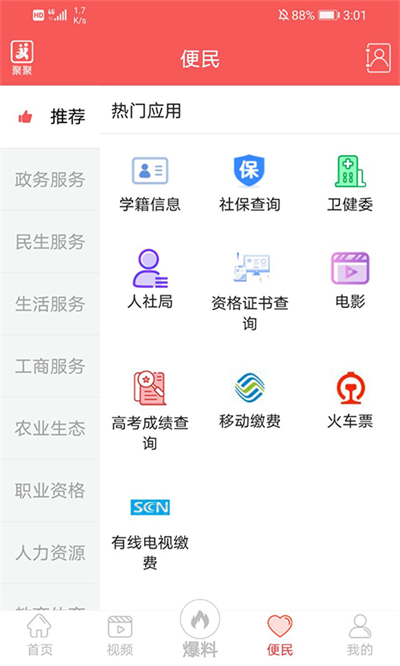 1、从首页切换到便民界面,点击政务服务的“学籍信息”。