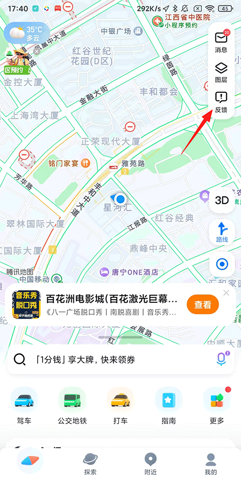1、打开腾讯地图APP,点击首页右上角【反馈】;