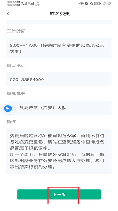 3、选择地区、区县和办事单位后,点击下一步;