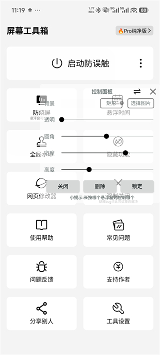 开启悬浮窗后,长按悬浮窗区域即可唿出控制面板(长按时间可在设置中调整)。通过控制面板,用户可调节悬浮窗的透明度、圆角、宽度和高度等参数,还支持锁定、删除、关闭悬浮窗等操作。长按特定悬浮窗,即可控制该悬浮窗。
