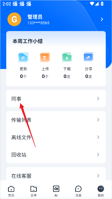 2、在个人中心中找到并点击【同事】,进入团队管理界面。
