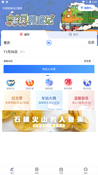 1、下载安装后打开软件,在首页-出行输入出发地址和到达地址以及出发日期,点击购买火车票。