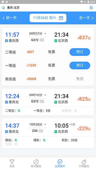 2、可以查询到出发当日的所有车次信息以及价格出发时间等,选择自己要购买的车次和座位,点击预订。