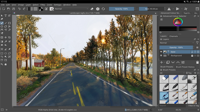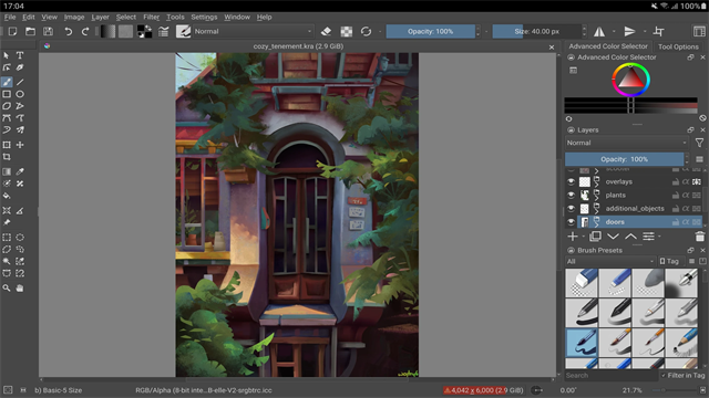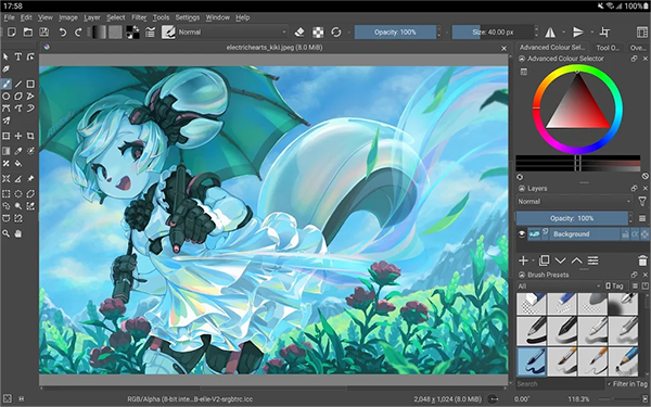 Krita 自带了超过 100 种专业的笔刷预设,它们照顾到了各种风格的需要。你可以加载其他笔刷包,也可以观察、调整笔刷的参数,自行学习制作笔刷预设。