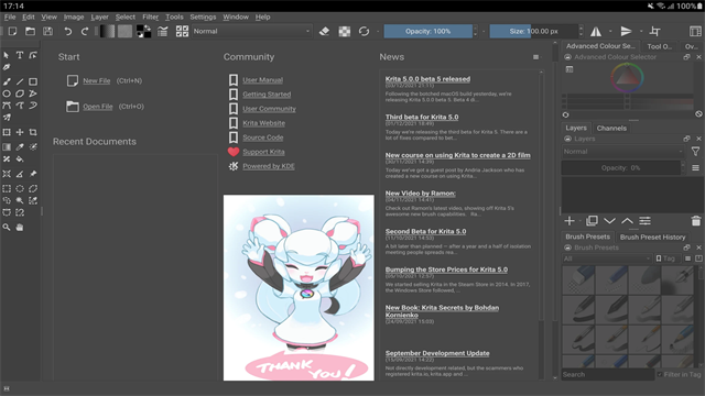 创建了新图像后,Krita 窗口就会显示它的画布,你可以立即使用鼠标或者数位板的压感笔在它上面进行绘画。Krita 在启动后会默认选中手绘笔刷工具。