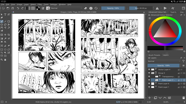 Krita 支持矢量图形,还内建了矢量图形库可以随意拖放素材,方便漫画制作。你可以修改矢量形状的锚点,打造自己的矢量素材库。你可以通过文字工具插入文本并进行简单的排版。Krita 的矢量图形完全兼容 SVG 规范,可以导入或者导出 SVG 图形。