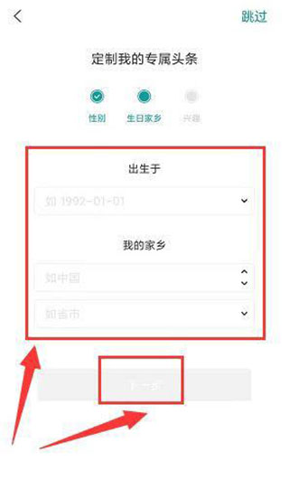 4、在定制我的专属头条界面,选项男、女按钮,单击下一步选项。