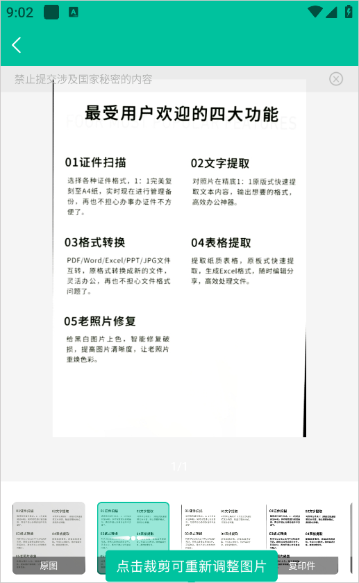 身份证、护照、驾驶证、营业执照拍照快速提取文字,拍照或相册选图,自动切边去杂乱背景,生成高清扫描件。