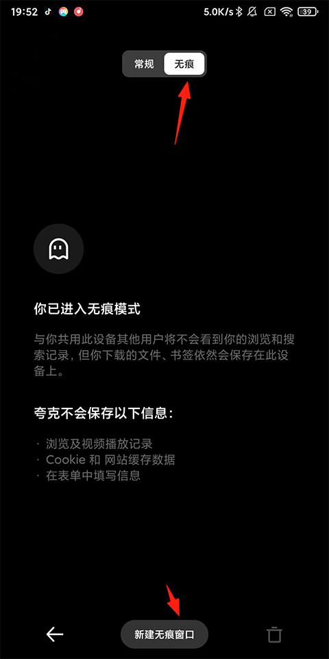2、点击上方【无痕】,点击下方【新建无痕窗口】;