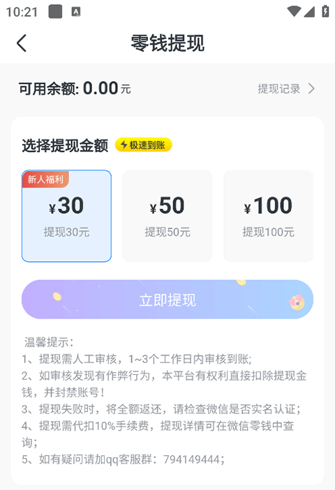 3、淘小说支持30、50、100元提现,点击下方立即提现即可提现到微信。