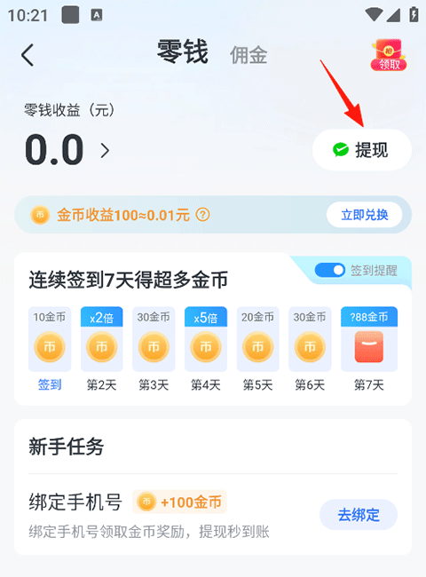 2、金币收益100=0.01元,通过金币兑换零钱来赚取佣金,随后点击提现;