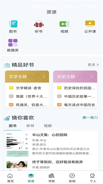 期刊、听书、学术期刊的电子资源下载后,可在书架中统一管理,支持离线阅读。