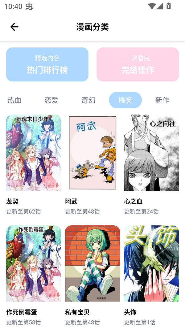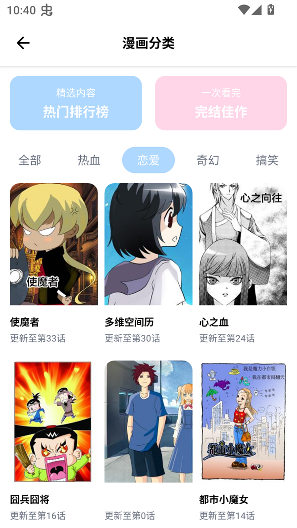 2、接下来我们就可以在分类里获取到热血、恋爱、奇幻、搞笑等多种不同题材的漫画资源进行选择,从而找到自己喜欢的漫画。