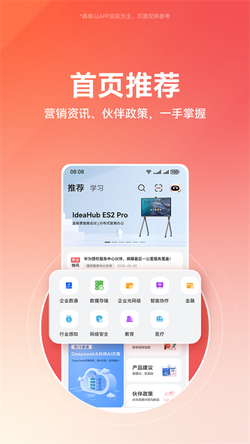 软件聚合了华为商业市场主推的热销产品、场景化方案、成功案例、热门资讯等精品内容;用户可以通过软件获取最新的产品信息、行业动态和商业趋势,保持与行业的紧密联系;