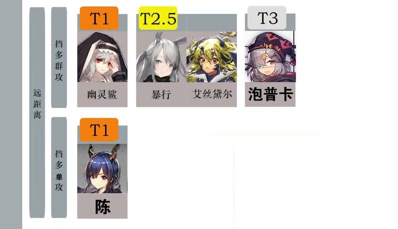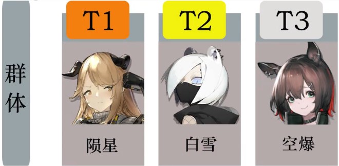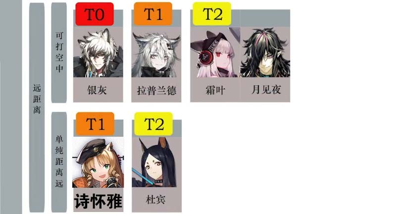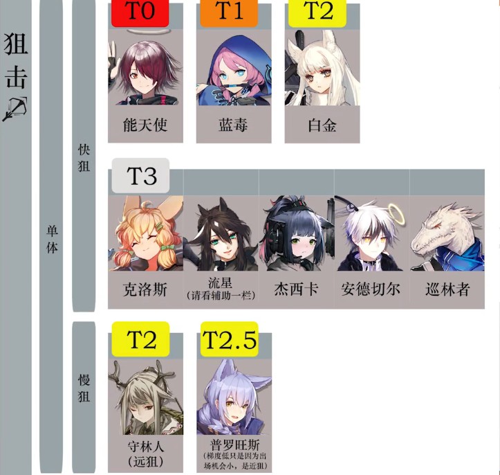所以需要练2个高速单体对空狙,你从下图中选择两个快狙即可。有能天使、蓝毒最佳,没有的话克洛斯、流星、杰西卡前期也能顶替。